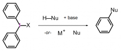 Diaryliodonium salts are well-known to transfer an aryl group to carbon and heteroatom nucleophiles, and in some cases a base is required [1]. However, transition metal catalysts and supporting ligands are not needed. Moreover, reactions conducted with diaryliodonium salts are operationally simple because they are non-toxic and are not sensitive to air or moisture. Therefore diaryliodonium salts offer an important alternative to metal-catalyzed arylation reactions. Despite these attractive characteristics, a major obstacle to their adoption in chemical synthesis and discovery chemistry has been commercial availability.